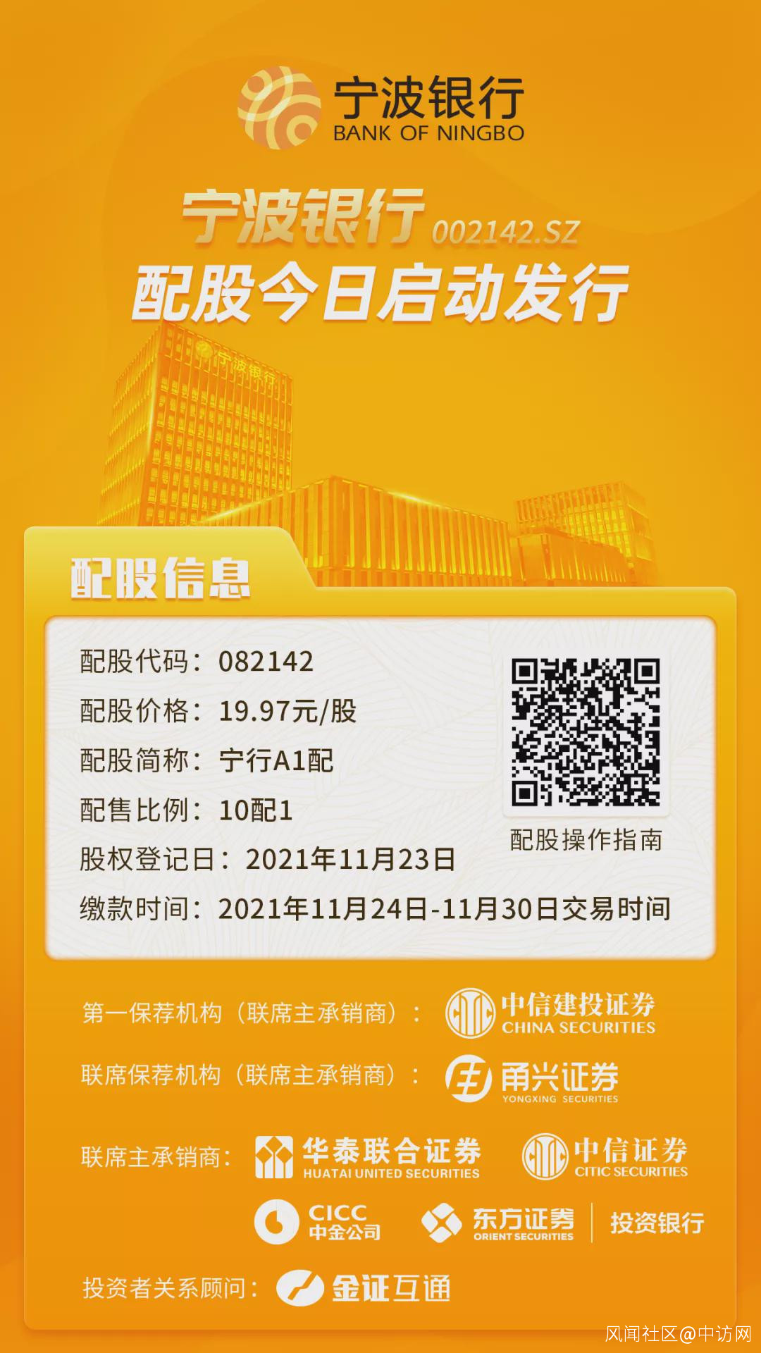 11月18日晚間,寧波銀行發佈公告,將在11月23日收市後,向中國結算深圳分公司登記在冊的公司簡報A股股東進行配售,11月24日(R+1日)起至2021年11月30日(R+5日)的交所正常交易期限,到期深期未繳款者自願放棄配股認購權。