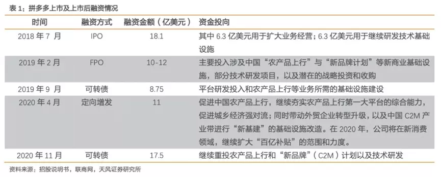 自2018年7月上市以來,拼多多共有4次再融資行為。在資金用途的説明中,有兩個詞的出現頻率最高,分別是研發、農產品上行。