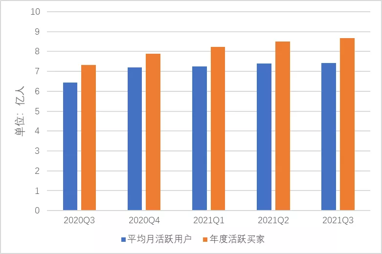 截至2021年9月30日,拼多多過去12個月裏的年度活躍買家數增長至8.7億,單季新增1740萬。拼多多APP三季度的平均月活用户數達7.42億,同比增長15.3%。