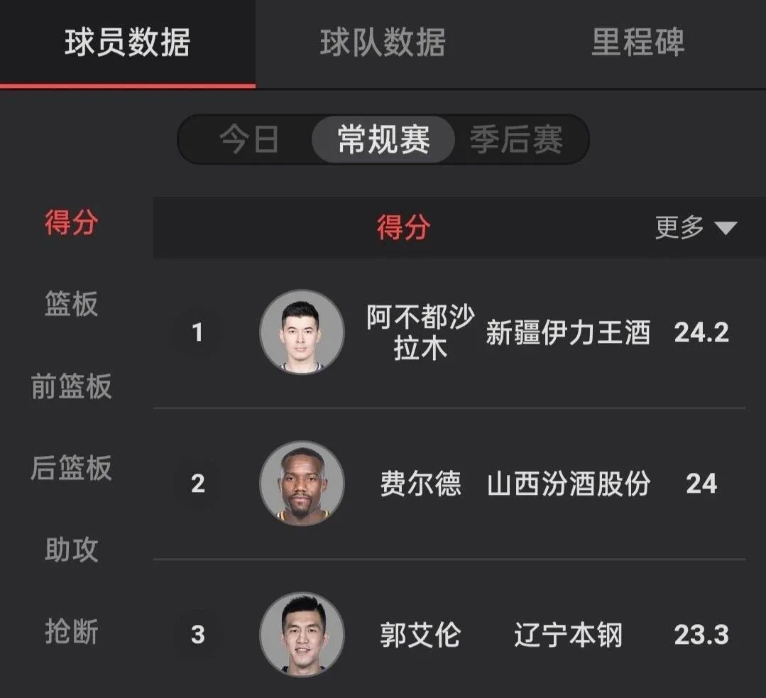 CBA聯賽第一階段13輪比賽結束,阿不都沙拉木場均得分24.2分,排聯盟第一。