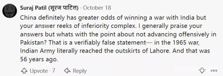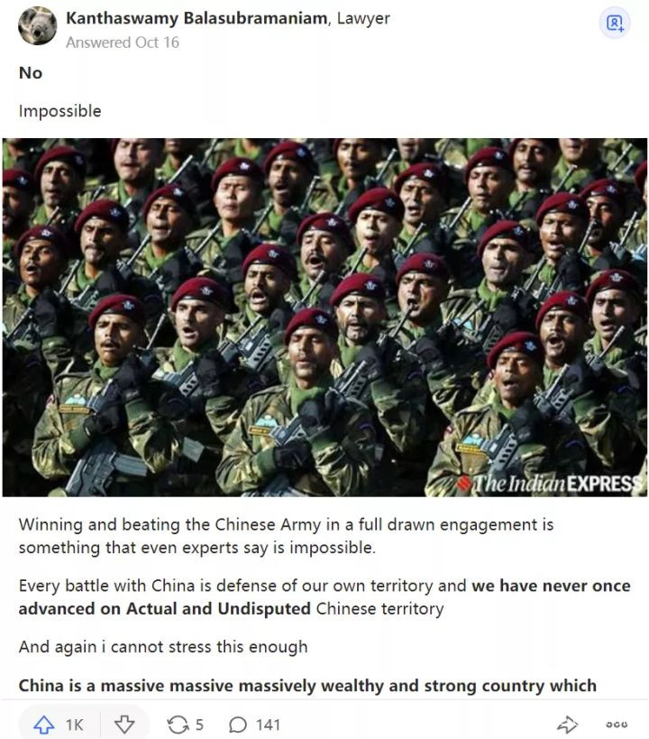 印度網民幾乎包攬了全部的答案,很多人都對印度軍隊有信心,但是理智的人會提出自己的異議,例如印度律師 Kanthaswamy Balasubramaniam 就發表了自己的看法,並獲得了1000+高贊。
