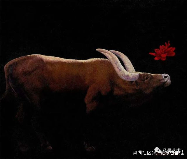 這幅《看見-1》,看似淡薄,暗藏玄機,在它誕生後,沒過多久,有了面目看似突變,實則貫一的《看見》一系列的創作,基本都是動物突然看見眼前花朵的存在,都被眼前鮮花的存在所迷住,這種看見鮮花的存在實際上是看見了自我個性的存在。這種圖式完全是哲學的圖式,一種抽象概念的抒情,或一種寓言的敍説,或一種現實的預言,因為到目前為止,除了人還沒有哪種動物真的能看見鮮花剝離出來的單一存在,這完全是神式的存在,不可能是動物式的存在,自然在神與動物之間確實有這種人智慧的存在式。