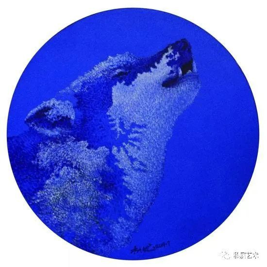 藝術家丁秋髮畫這幅畫的時候,選擇了海藍的底子,雪狼的圖式就是一座山峯,只是選擇雪後的瞬間來進行刻畫,只是藝術家別出心裁的用了法國畫家喬治·修拉發明的點畫,這一畫法後來荷蘭畫家梵高弘揚過,點畫就是以點為牛慢慢耕作整幅畫,很機械,很笨,沒有用藝術家都熟悉的點線結合的畫法,故意挑戰一般藝術家都習慣都很瀟灑的筆墨,而是用點來構成刻畫,特別製造出生澀感、陌生感,人為造成一種畫面圖式的結巴,特別強調了每個色點的獨立性、自由性、起鬨性,但在看似失去旋律、懸崖突兀卻組成畫面驚險的和諧,就像一場雪的漫天飛揚,看似紊亂,卻有一種心吸鐵石的看似自由實有內在的秩序。