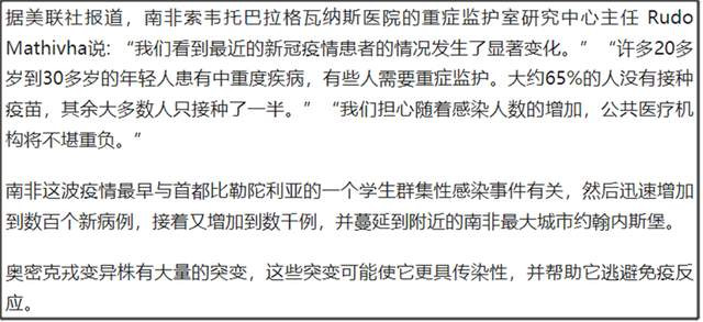 比如美聯社的這篇報道,是引用南非索韋託巴拉格瓦納斯醫院的重症監護室研究中心主任 Rudo Mathivha的描述,按照這名主任的描述“許多20多歲到30多歲的年輕人患有中重度疾病,有些人需要重症監護。大約65%的人沒有接種疫苗,其餘大多數人只接種了一半。”“我們擔心隨着感染人數的增加,公共醫療機構將不堪重負。”