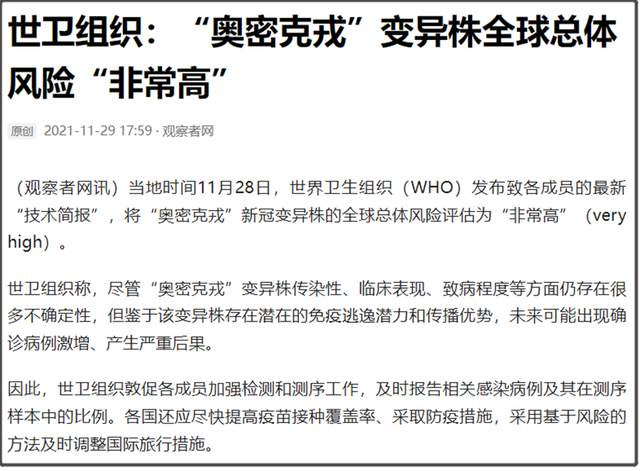首先是世衞組織在28日,發佈最新的“技術簡報”,將奧密克戎變異毒株的全球總體風險評估為“非常高”。