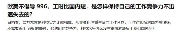 “歐美企業競爭力強,根本原因是佔據了高端「生態位」,和是否996關係不大。”