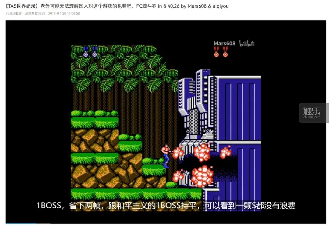 Mars的另一個項目是FC版《魂鬥羅》速通,國內的老玩家對此再熟悉不過了——“紅人”和“藍人”,比爾與蘭斯,兩個熱血戰士直搗虎穴,他是這項TAS的世界紀錄保持者。《魂鬥羅》在國內是一代人的回憶,但在歐美沒那麼有影響力。Mars在發佈視頻時,想到了一個頗為傷感的標題——《老外可能無法理解國人對這個遊戲的執着吧》。既孤獨,又有點自豪。