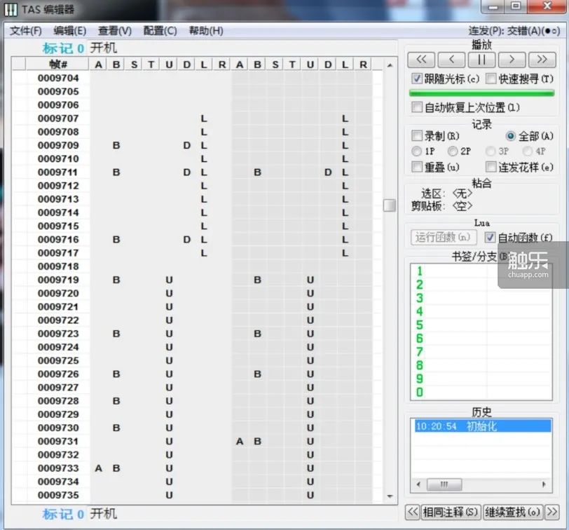 Mars的TAS編輯器,左半部分記錄了遊戲中每幀的按鍵