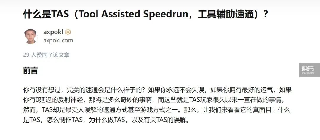 知乎上有好奇的玩家提問:“TAS究竟是什麼?”回答只有零零散散的幾篇,但篇幅都很長,大多一眼能看出是出自圈內人之手。其中有一句説得不錯:TAS的本質是影像的記錄。