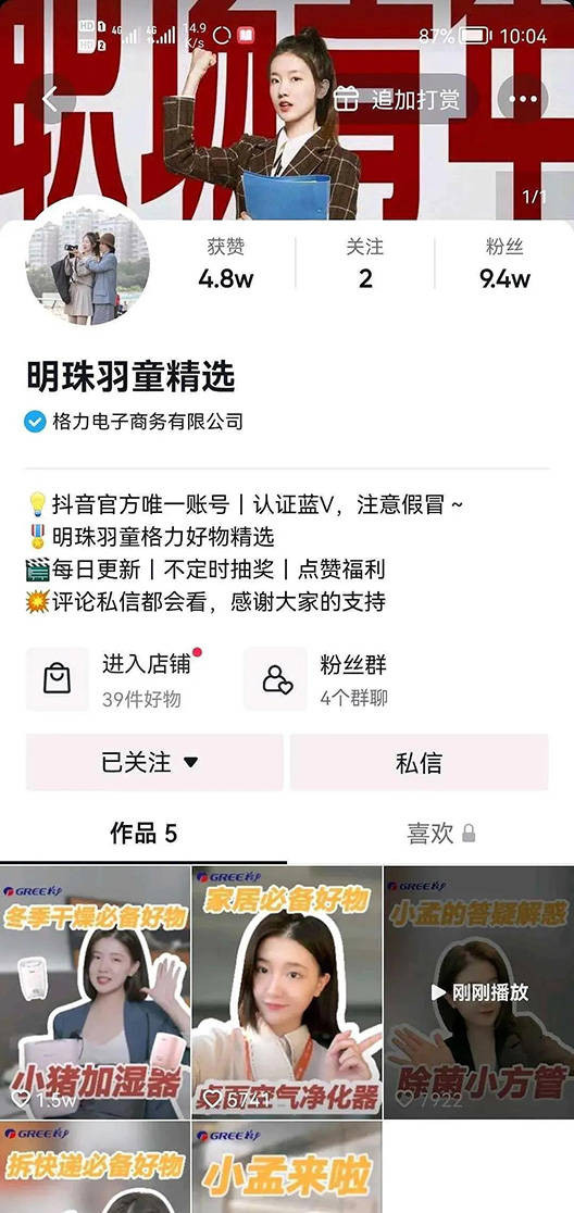 不懷疑李國慶的直白的判斷和洞察,因為電商已經成為格力電器渠道變革的重中之重,董明珠自己都已經赤膊上陣,鬧騰過很多回了。可年紀擺在那兒,1954年出生的董明珠67歲了,而直播帶貨是一碗青春飯,看顏值,看臉蛋,看身材,確實不適合董明珠長久吃下去,急需替代人選。孟羽童確實是最好的人選之一,具備成為直播帶貨網紅的基本條件,能夠彌補董明珠的不足。如今孟羽童確實在直播帶貨的大道上躍馬揚鞭,開設了“明珠羽童精選網店”,“將在此賬號分享格力電器的產品”,開始了直播帶貨之旅。