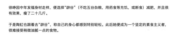 於是陶虹也跟着去“辟穀”,稱自己的身心都感到特別輕鬆。此後她便成為一個堅定的素食主義者,很難接受稍微油膩一點的食物。