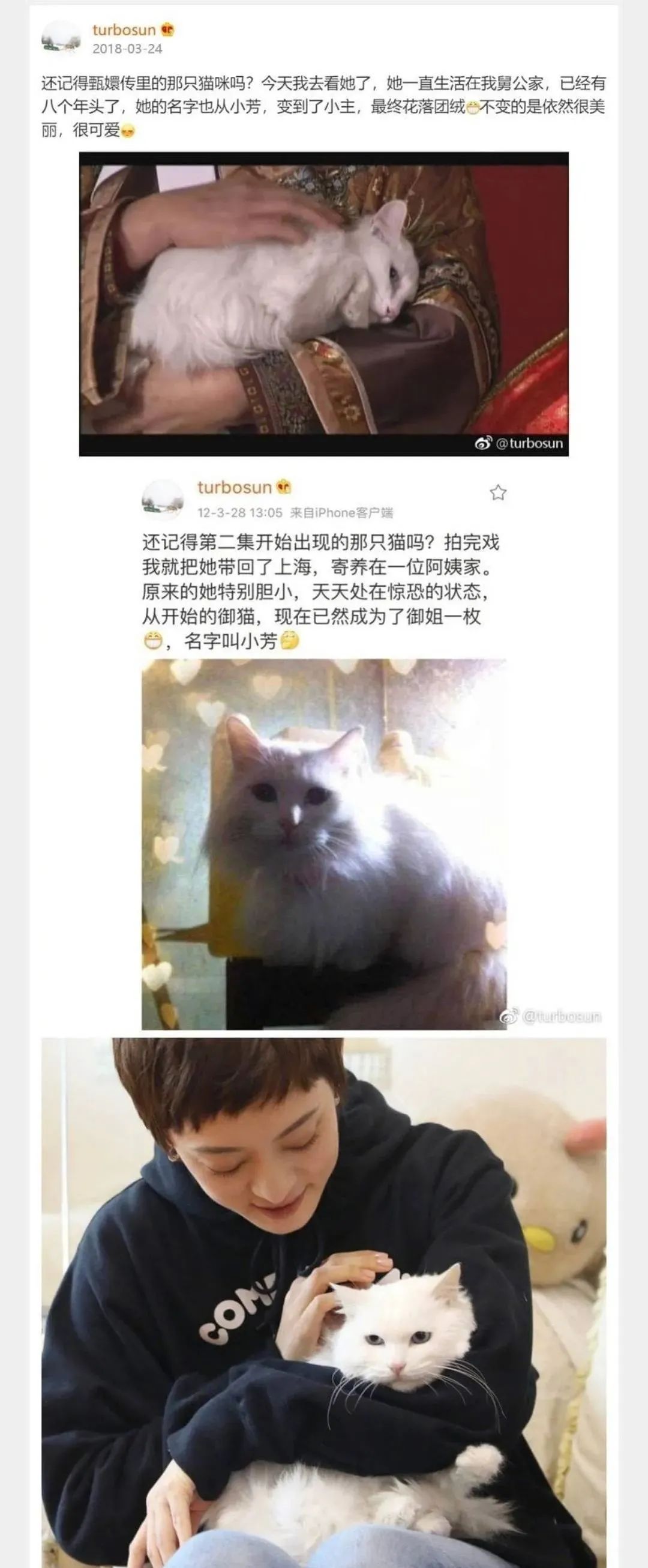 而她此前,還收養了《甄嬛傳》裏的一隻流浪貓,貓生從此不再風餐露宿,一直幸福地生活在舅公家。