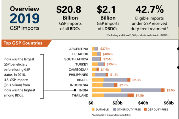 近年來,美國會議員就是否繼續將新興市場發展中國家(如印度、巴西、土耳其)納入受惠國範圍,或將該計劃限制在最不發達國家提出了一系列新的觀點。其中的一些爭議涉及被視為“進口敏感”產品的免税准入問題,以及某些受惠國因涉嫌侵犯勞工權利、未能保護知識產權和其他做法而遵守普惠制資格要求的擔憂。2019年5月,時任美國總統特朗普根據土耳其經濟發展情況,終止了其普惠制資格;同年6月,以市場準入問題為由終止了印度的普惠制資格。其中,印度在被撤出美國普惠制受惠國名單之前,是美國普惠制的最大受益國。美國貿易代表辦公室數據顯示,美國對印度的商品和服務貿易逆差為273億美元,印度對美國出口享有零關税的商品規模有57億美元。