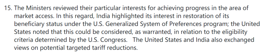 11月23日,美印貿易政策論壇第12次部長級會議發佈聯合聲明,承諾將繼續合作解決懸而未決的貿易問題,其中就包括重新考慮印度的普惠制待遇。印度的普惠制待遇在特朗普執政時期(2019年6月)被取消。當時美國貿易代表辦公室(USTR)給出的理由是:“印度未能保證‘公正合理的市場準入權利’,印度通過一系列貿易壁壘,對美國商業產生了嚴重的負面影響……”。儘管後續美國與印度進行了密切接觸,但印度仍未能採取必要步驟“達到普惠制標準”。在此次發表的聯合聲明中,美國表示,印度恢復普惠制待遇的請求可以根據美國國會確定的資格標準,在必要時予以考慮……