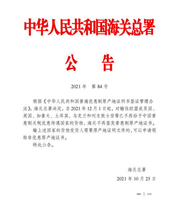 **事件:海關總署於10月25日發佈2021年第84號公告,**自2021年12月1日起,對輸往歐盟27個成員國、英國、加拿大、土耳其、烏克蘭和列支敦士登等已不再給予中國普惠制關税優惠待遇國家的貨物,海關不再簽發普惠制原產地證書(Form A)。輸上述國家的貨物發貨人需要原產地證明文件的,可以申請領取非優惠原產地證書。