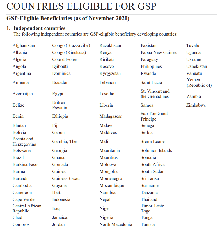 2020年11月以來,符合美國普惠制資格的受惠國如下: