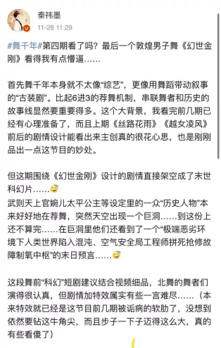 所以這也是為什麼,《舞千年》的節目組整體有很多不成熟的地方,運鏡也比較亂,特效青澀,經費缺到想拍個敦煌舞都沒法親自去敦煌取景(説句題外話:經費不足卻做得好,也是B站出品的老標籤了)。