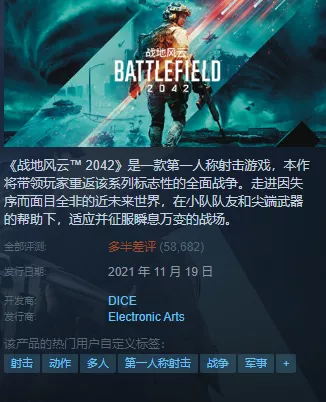 因此目前在Steam上,雖然《戰地2042》擁有近6萬條評測,但好評率僅為34%,目前狀態為“多半差評”。