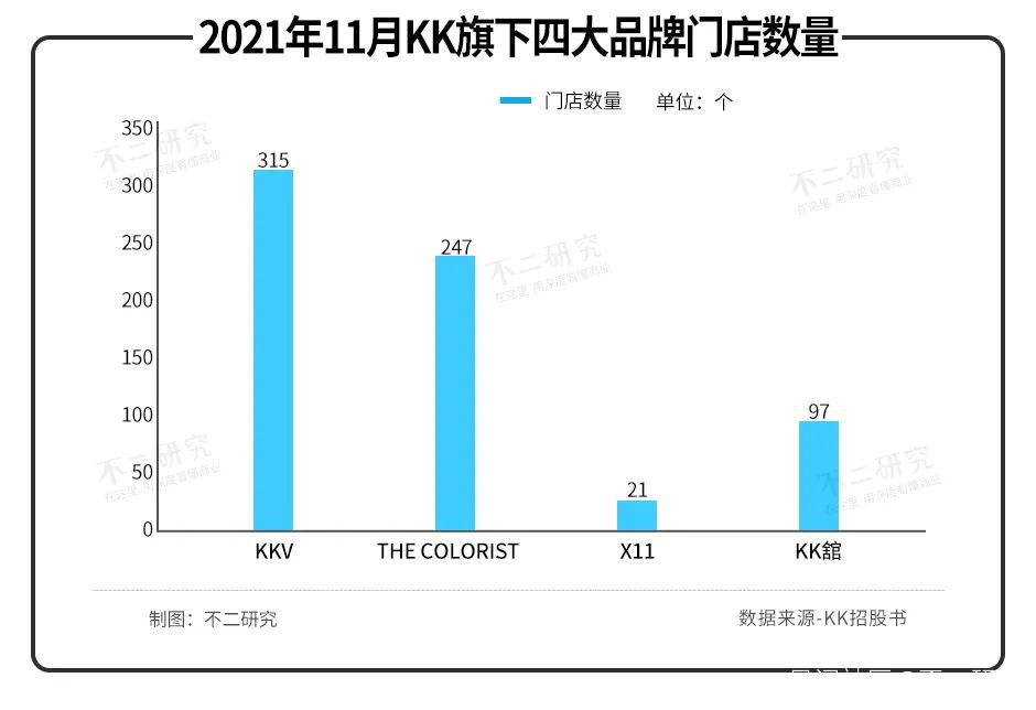 最新數據顯示,截至11月KK旗下門店共680家,其中KKV共315家,THE COLORIS共247家,X11共21家,KK館97家。從2019年5月創立至2021年6月,兩年內KKV門店數量達281家,經粗略計算幾乎2-3天就將開一家新店。