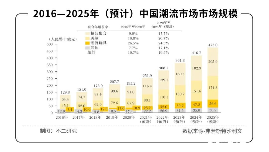 潮流零售擁有千億級別的廣闊市場。根據弗若斯特沙利文,2020年潮流零售市場規模為1952億元,預計2025年市場規模將達到4750億元,複合年增長率高達19.5%;而同期中國整體零售市場規模年複合增速分別僅為5.9%。