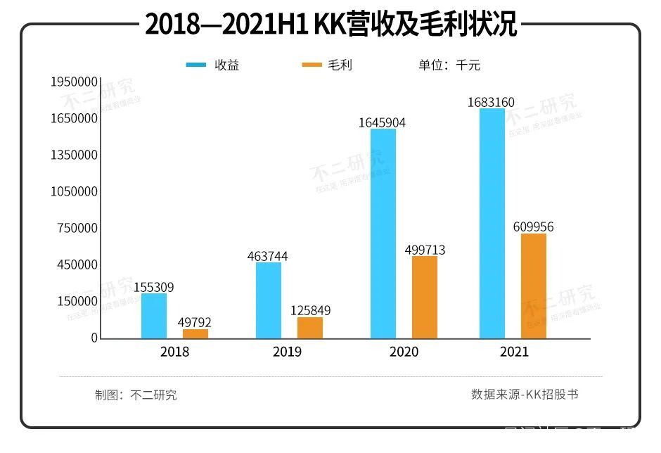 從毛利潤來看也是如此。2018—2020年以及2021年上半年,KK毛利潤分別為0.5億、1.26億元、5億和6.1億元,幾乎每年都呈現翻倍式上漲;其中2020年下半年毛利潤為3.48億元,全年佔比達69.63%,較2020年上半年增長129.27%。