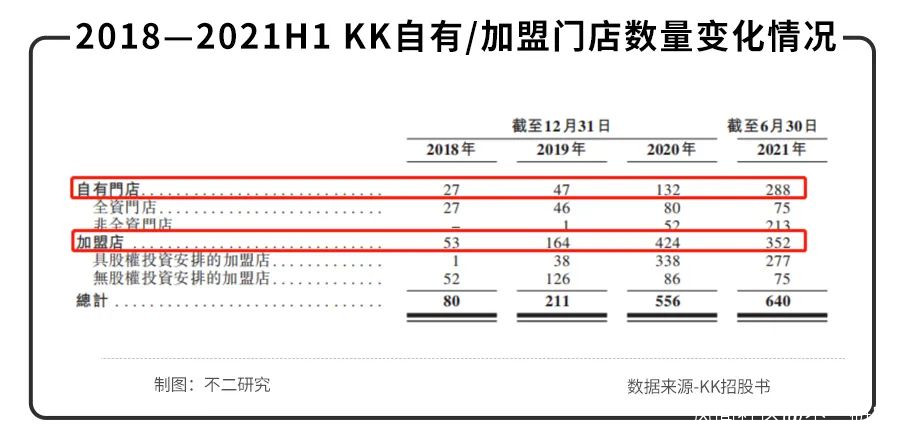 KK的門店包括加盟店與自營店。據招股書,截至6月KK旗下門店共有640家,其中自營店有288家,加盟店有352家,以加盟店為主。