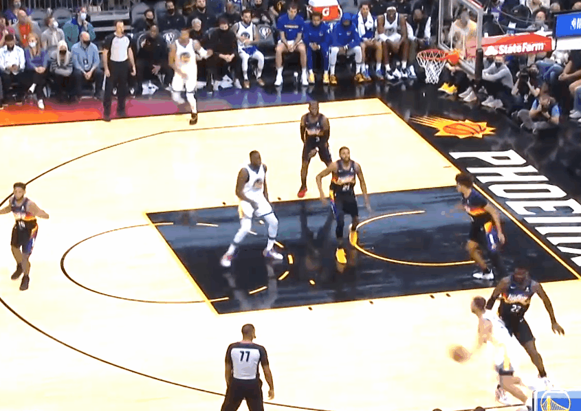 卡梅倫·約翰遜壓迫底角,艾頓衝出來補位,卡梅倫·佩恩跳步延阻庫裏,等艾頓對上庫裏後,佩恩返位,約翰遜站底角,保羅弱側接應。