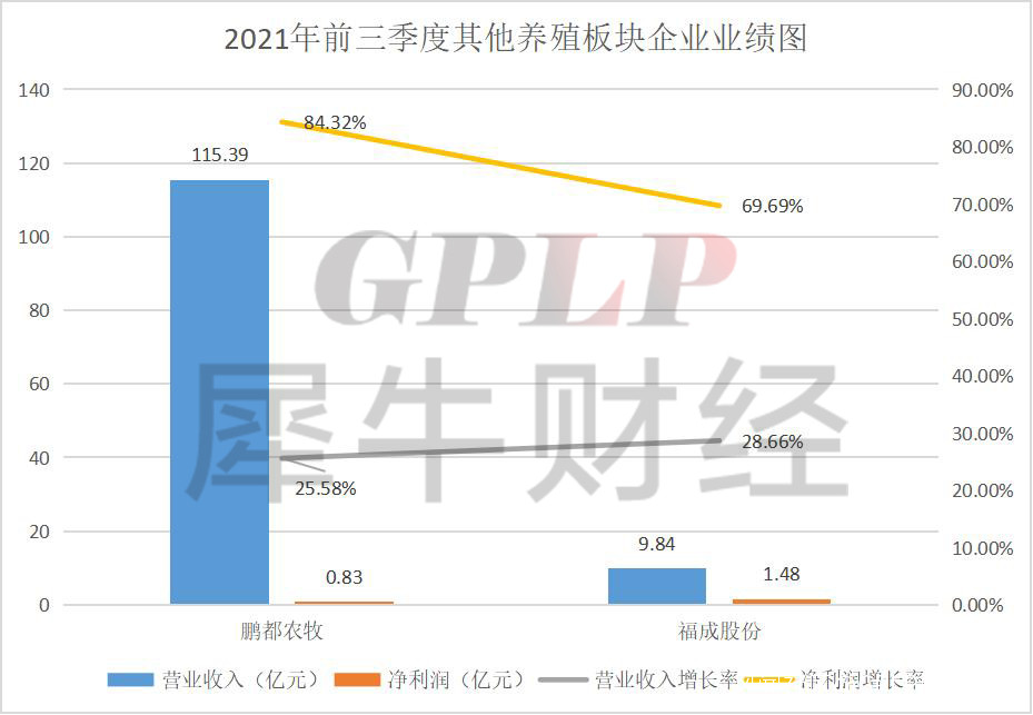 整體而言,其他養殖板塊企業在2021年前三季度的業績均出現增長。當期,鵬都農牧和福成股份的營業收入分別增長了25.58%、28.66%;淨利潤分別增長了84.32%、69.69%。當然,上述兩家企業的高增長有部分是建立在2020年同期業績下滑、基數較低的基礎上的。