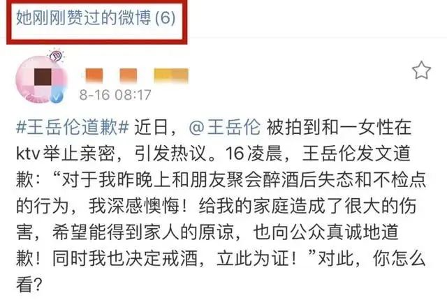 之前王嶽倫出軌道歉,被全網討論的時候,王詩齡默默點讚了他的道歉微博。