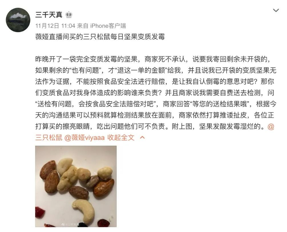 2021年11月12日,一位名叫“三千天真”網友發微博稱,自己“雙十一”期間,在薇婭直播間購買的三隻松鼠產品出現了質量問題,並對三隻松鼠不負責任的售後處理,表達了嚴重的不滿。