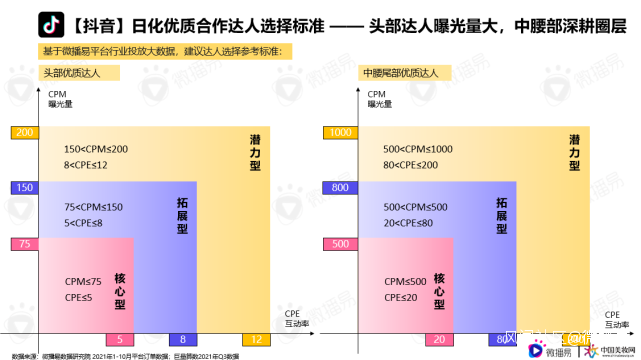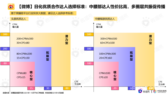 根據微播易平台多年累積的行業投放大數據,提出優質達人的性價比數據參考建議,以曝光量CPM數據和互動率CPE數據雙維度,框定核心型、拓展型和潛力型日化合作達人。