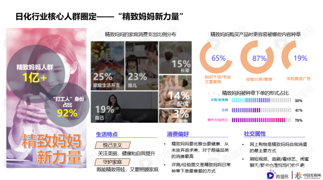 女性對家庭安全高度敏感,在家中更有消費決策權,因此以精緻媽媽為代表的社會新力量也是日化行業的核心目標羣體,更應被品牌關注和觸達。在我國,被貼上精緻媽媽標籤的人羣已超過1億人,且92%都是職場女性身份。她們在關愛家庭健康的同時也關注自身變美、自我提升。在購買產品時更容易受經驗分享、達人推薦等方面的引導,是品牌種草轉化的關鍵人羣。