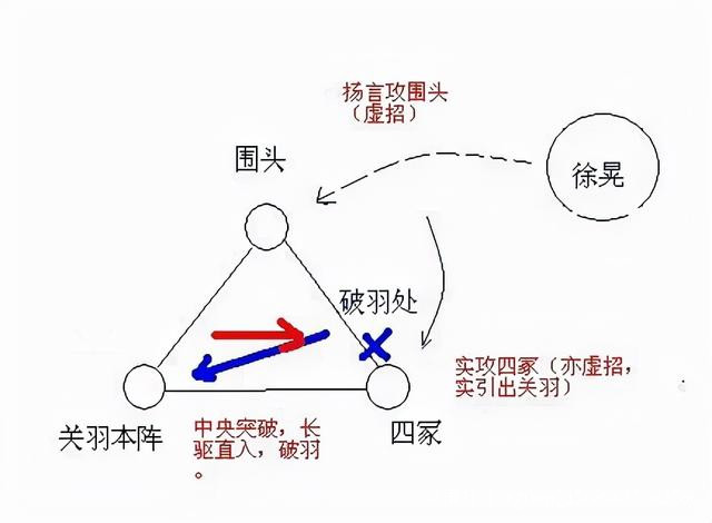 此時,樊城外尚有積水,關羽軍主力在一個大土堆上(圍頭),其他圍城部隊則分別部署在另外四個高地上(四冢),成犄角之勢。孫子曰:“善攻者,敵不知其所守。”所以這一仗,徐晃就用一個“聲東擊西、引蛇出洞、圍點打援”之計,假裝要攻打圍頭,卻出其不意突襲四高地;四高地猝不及防,節節敗退,形勢岌岌可危。關羽聞訊忙率步、騎兵五千人出援,結果正好碰上徐晃在半路等着呢!