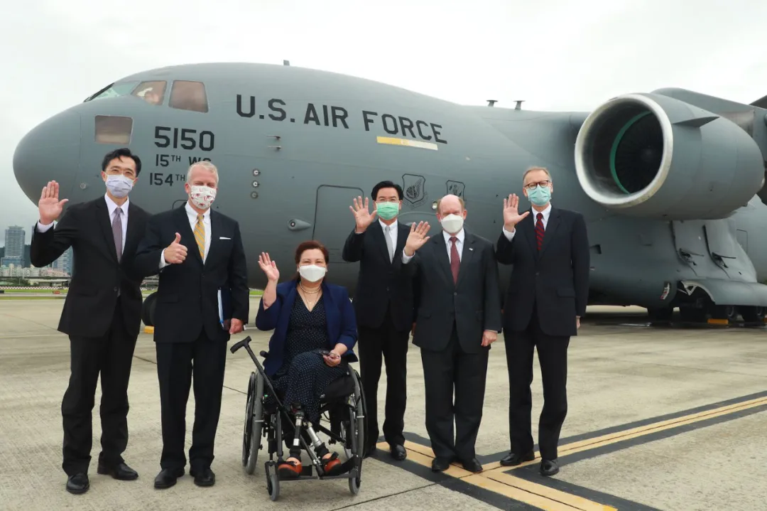 ▲2021年6月6日,美國參議員乘坐軍用飛機前往台灣宣佈所謂的疫苗捐贈計劃並在機場合影。