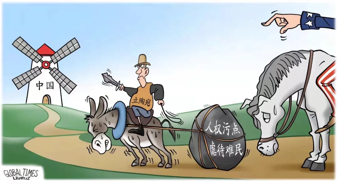▲立陶宛實為美國劍指中國的工具,還被國內人權問題和虐待難民問題拖得寸步難行。美國卻躲在後面坐享其成。(漫畫 | 劉蕊)