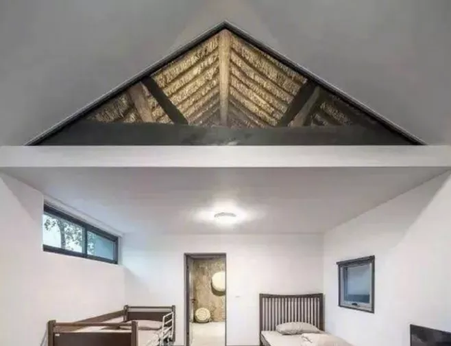 他們完整的保留了青瓦屋頂和南側的夯土牆,然後在原本的承重牆上,支起一個跨度近七米的橫樑來支撐屋架,將一個現代化、模塊化的房間直接內置在其中。
