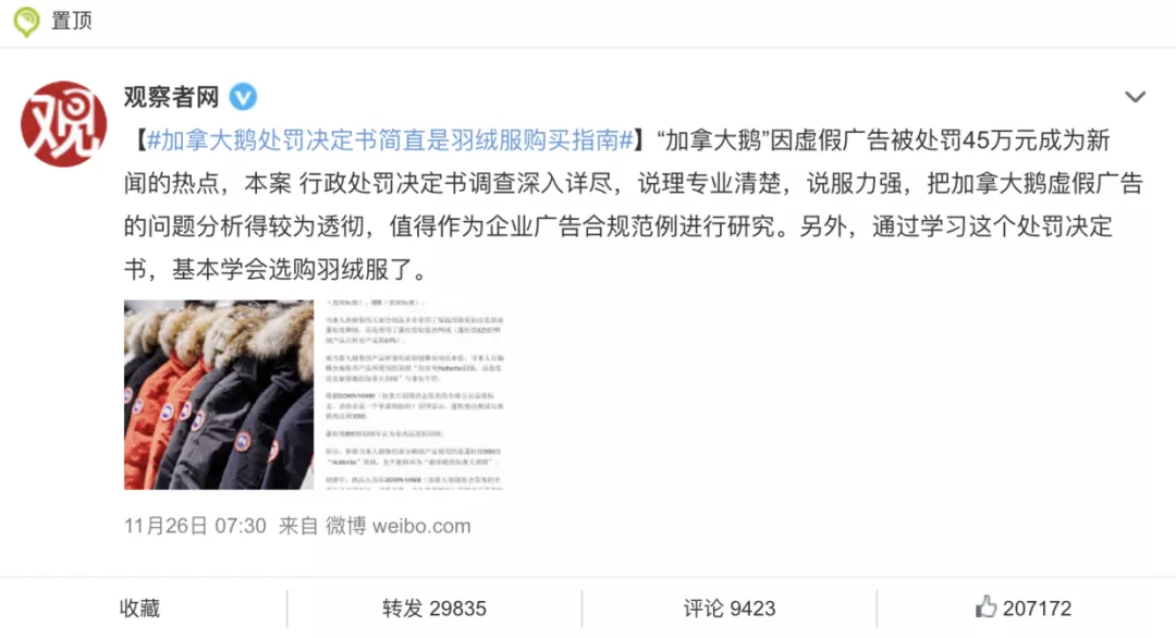 加拿大鵝的處罰決定書成為羽絨服購買指南,更是在某種程度上戳穿了加拿大鵝割韭菜的假面。