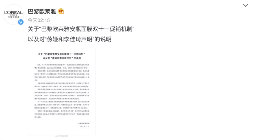 壓力之下,歐萊雅於深夜道歉,但僅將問題歸咎於繁瑣的促銷機制,對涉嫌虛假宣傳等問題避重就輕。