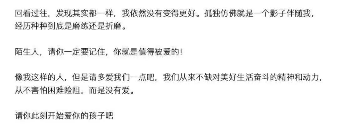 “像我這樣的人,但是請多愛我們一點吧,我們從來不缺對美好生活奮鬥的精神和動力,從不害怕困難險阻,而是沒有愛。”