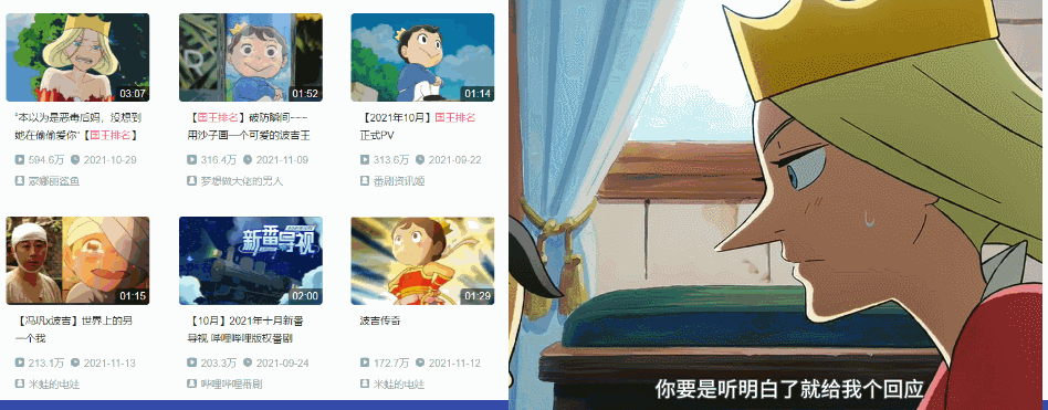 現代觀眾多半能與這些配角的煩惱產生共鳴,也會期盼着現實中也有波吉這樣的孩子能讀懂自己。儘管B站上有繁多視頻試着從各類角度推薦這部動畫,但就像《國王排名》當初在日本走紅一樣,打動了最多人的依然是那個傲嬌的希琳王妃和親吻她臉龐的波吉。