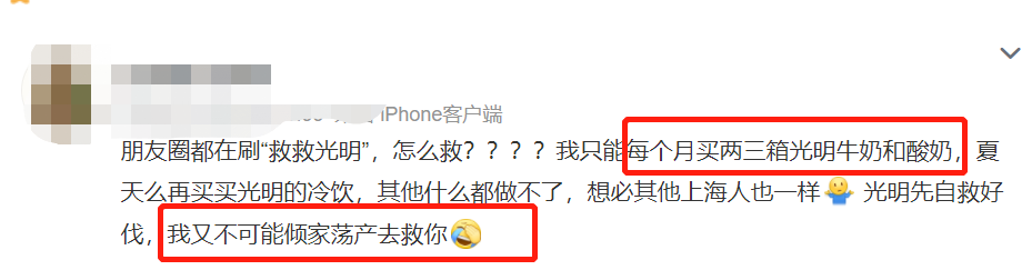一篇《救救光明》的文章傳的沸沸揚揚,網友們紛紛開啓“回憶殺”,跑到超市野性消費,有網友甚至表示每月買兩三箱牛奶支持,光明無奈之下出來澄清:我們沒有倒,只是發展的不太好了。