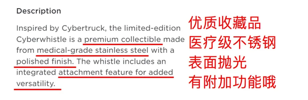 根據官網的描述,**這款賽博哨子堪稱馬斯克的得意之作!**選用醫療級不鏽鋼,耐蝕性更強,歷經風霜仍然不減魅力;更有特斯拉精湛的拋光工藝助力,表面紋理更顯大氣優雅。可以説是頂級收藏品啊,傳到孫子輩都能接着吹的那種