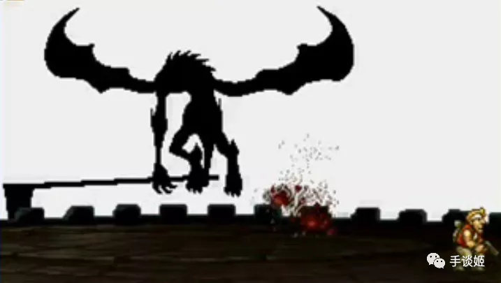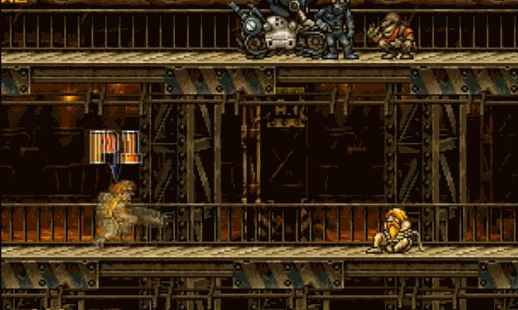 又比如,打着打着,掉落出一隻烤雞,玩家吃了之後,肚子就鼓起來了,動作也看起來特別慵懶,全然不似在炮火橫飛的戰場上,產生了別樣的喜劇效果……類似的演出比比皆是,也怪不得只要有人玩《合金彈頭》,就有那麼多路人會在他身後看着了。