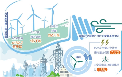 世界第一,已經成為我國風電的亮眼標籤。2010年底,我國風力發電累計裝機容量達到4182.7萬千瓦,躍居世界第一。此後,風電裝機一路領跑,於2015年首次突破1億千瓦;2019年則突破2億千瓦;而此次突破3億千瓦,僅用時2年。