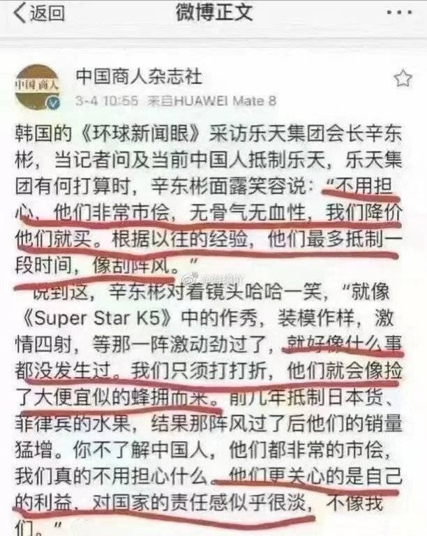下面是一張網上找到的一張韓國樂天集團會長評價國人的採訪文,這就是一些國人給他們留下的印象——讓打臉來得更猛烈些吧,説不定有打醒的呢?