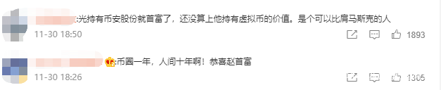 圍觀羣眾之中,有網友表示,趙長鵬是比肩馬斯克的人,因為光持有幣安股份就首富了,還沒算上他持有虛擬幣的價值。