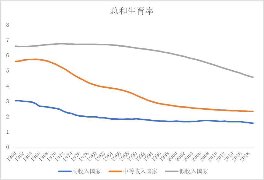 撒哈拉以南非洲總和生育率居高不下,與其是因為某些民族、種族或宗教因素,不如説是因為那一地區一直較為貧窮。總的來説,高收入國家的生育率低於中等收入國家,中等收入國家的生育率低於低收入國家,但它們的生育率基本上也都在下降。生育率下降是伴隨現代化過程的,背後原因很複雜。