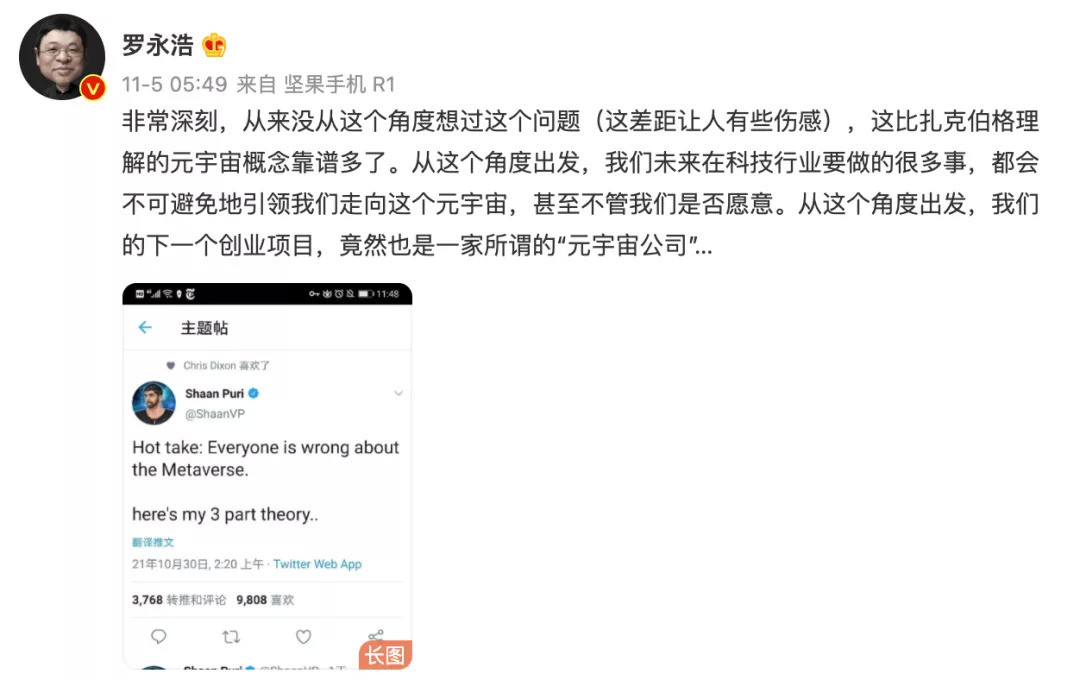 龍哥是羅永浩早年的外號之一,也是錘粉間的笑談。矩陣直播間的擴張,加上羅永浩11月5日在微博透露出“我們的下一個創業項目是一家所謂的‘元宇宙公司’”的信號,羅永浩似乎準備開始探索其他領域。