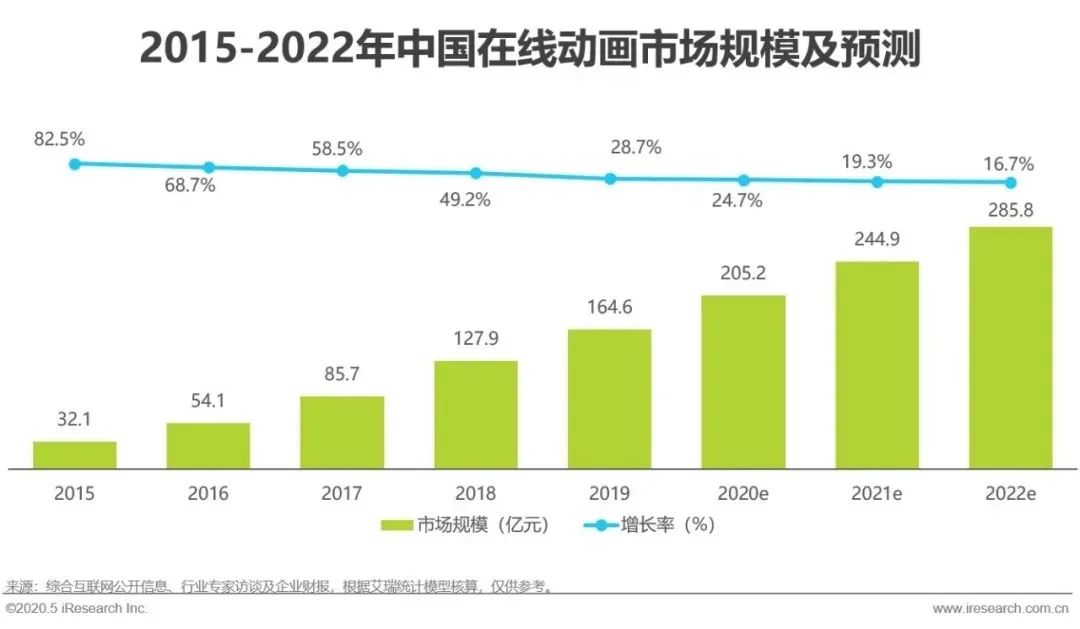 **偏偏從2015年左右起,國內在線動畫市場迎來一輪爆發,**艾瑞諮詢《2020年動漫產業研究報告》顯示,連續數年市場規模增佔率維持在50%以上,若干具備競爭力的新IP相繼誕生。