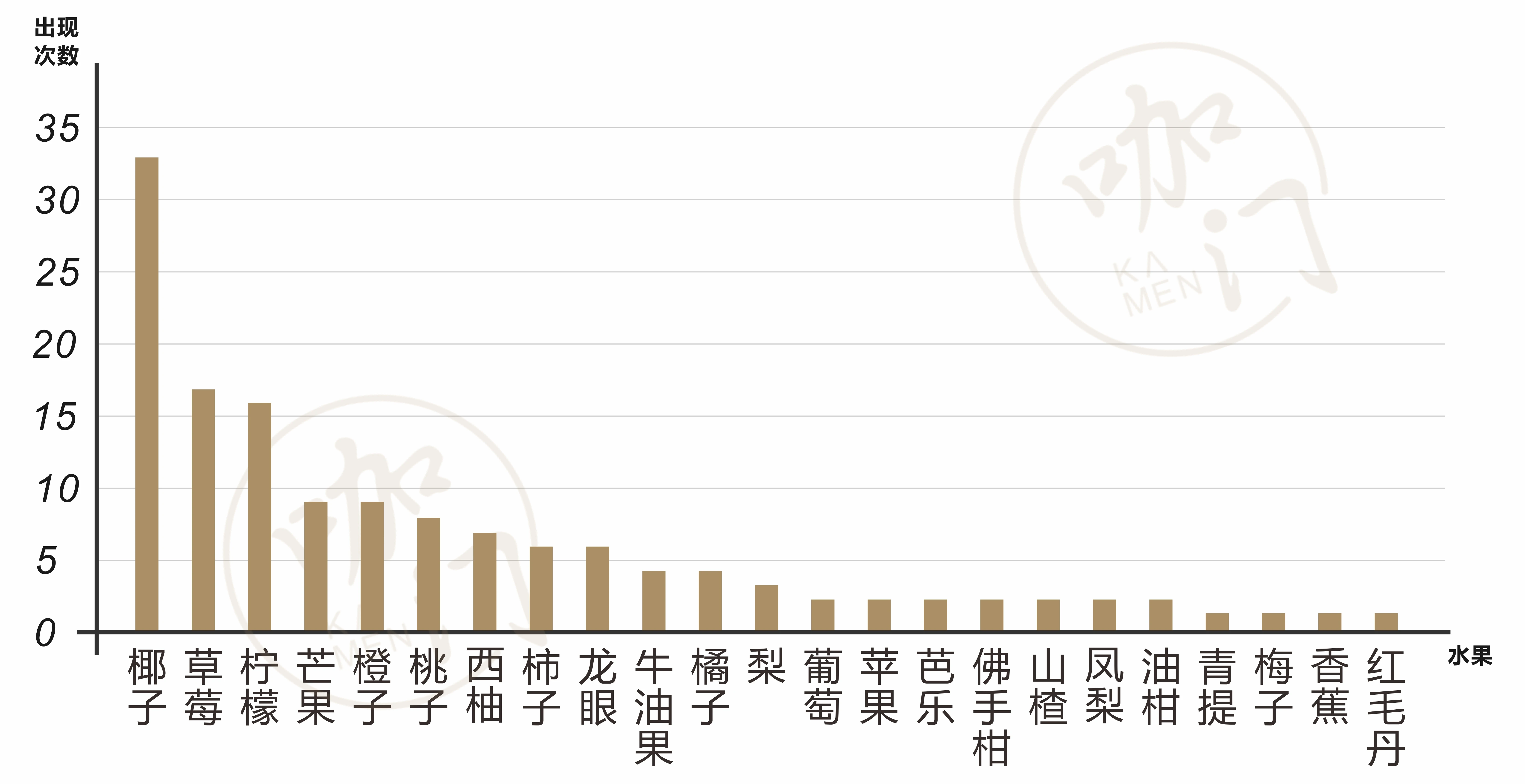 11月,在統計的260款新品中,共使用了32種水果。其中椰子元素使用量最多,為33款,其次是草莓和檸檬,分別使用了17款和16款。